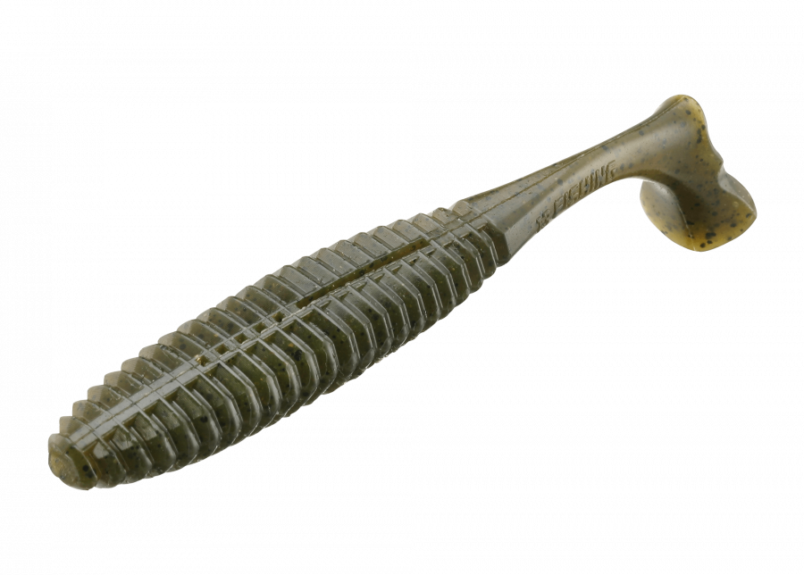 • Isca artificial flexível para pesca verde escura com brilhos e textura estriada