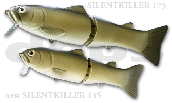 Deps New Silent Killer 145. swimbait articulado, de Deps. O novo Deps Silent Killer 145 é uma nova medida para o clássico Silent Killer, uma das iscas mais famosas da Deps. É caracterizada principalmente pela nova lâmina frontal, de formato especial. Recomendado para pesca de achigã e lúcio.