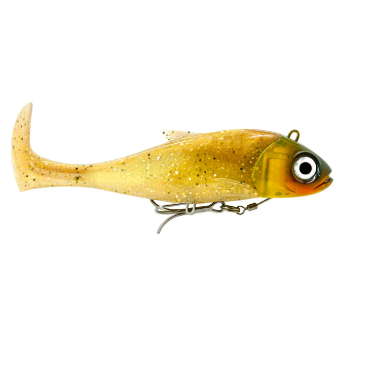 • Isca artificial castanha dourada com cabeça verde e olhos grandes