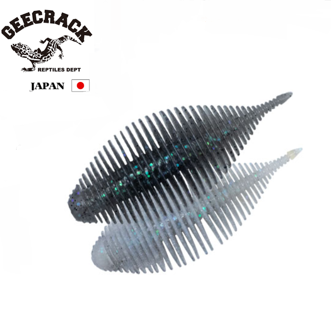 • Iscos artificiais estriados com texto GEECRACK REPTILES DEPT JAPAN e bandeira do Japão