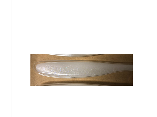 • Espátula de plástico translúcido com glitter sobre superfície de madeira