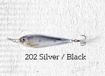 • Isca artificial prateada e preta com anzol triplo e pena branca