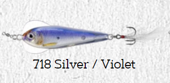 • Isca artificial prateada e violeta com anzóis e texto 718 Silver / Violet