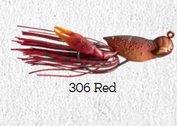• Isca artificial de pesca vermelha e laranja com saia vermelha e texto 306 Red