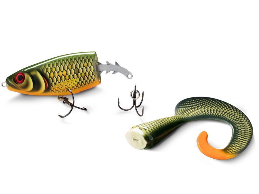 Corpo em ABS com cauda em PVC macio Sistema de travamento de cauda em placa de 6 pontos Wafting Curl cauda com rolo de corpo Peixe-jogo predador grande Anzol agudos VMC® Coastal Black ™ Cauda de reposição incluída