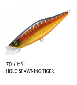 • Isca de pesca laranja HOLO SPAWNING TIGER 70 / HST com padrão escamas e olho amarelo