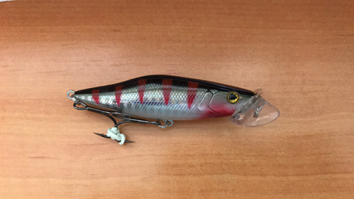 • Isca de pesca minnow vermelho, preto e prateado sobre madeira clara