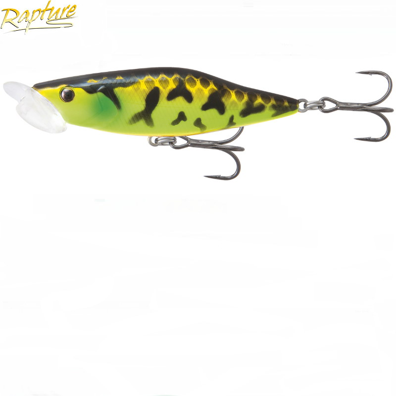 • Isca de pesca artificial verde, amarelo e preto com dois anzóis metálicos