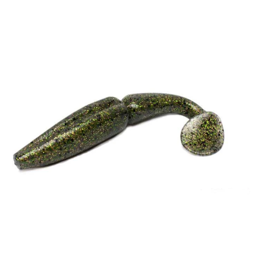 • Isca artificial de pesca tipo shad em plástico macio castanha com brilhantes verdes e prata.
