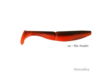 • Isca artificial flexível em laranja e preto para pesca com texto '120 - Ripe Pumpkin'