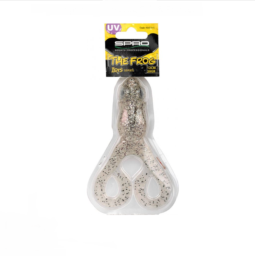• Isco de pesca em forma de rã transparente com partículas pretas, embalado plástico com etiqueta SPRO