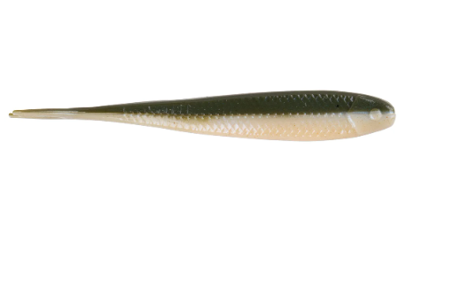 • Isca de pesca artificial verde translúcida com textura escamosa.