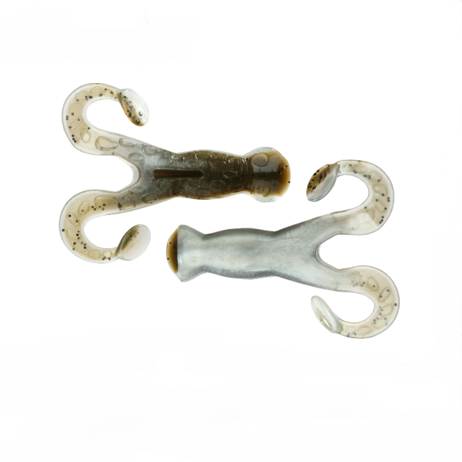 • Isca de pesca artificial em silicone castanho e amarelo com caudas curvas