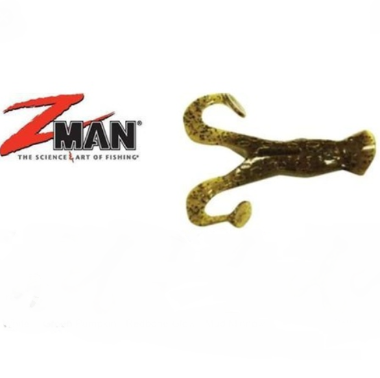 • isca de pesca em plástico macio castanho com pontas amarelas e logótipo ZMAN