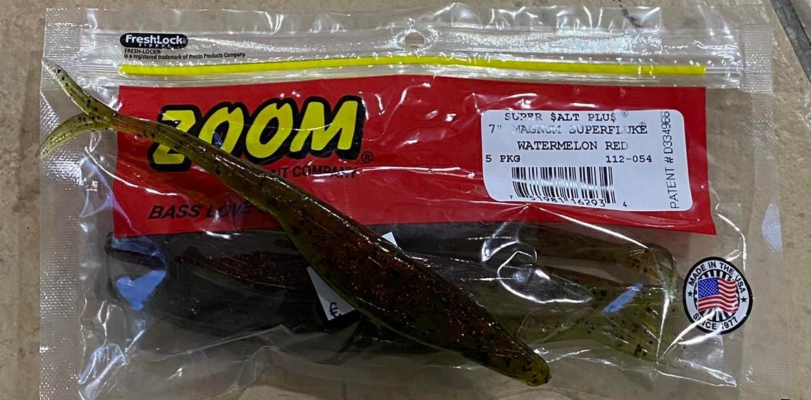 • Embalagem transparente com isca artificial para pesca da marca ZOOM em amarelo e preto, isca em verde e castanho com pontos vermelhos e selo da bandeira dos EUA.