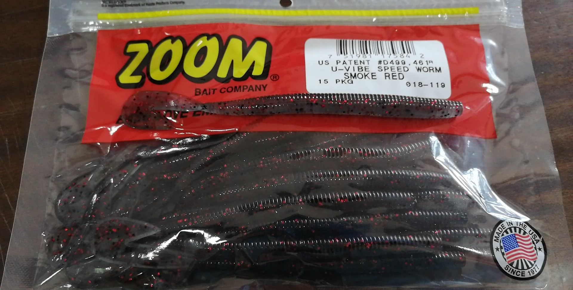 • Pacote de iscas artificiais Zoom Worm com etiqueta vermelha e selo com bandeira dos EUA