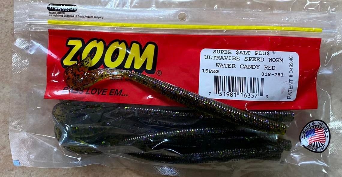 • Pacote de iscas de pesca Zoom Ultravibe Speed Worm cor Water Candy Red em embalagem plástica