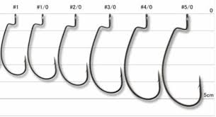 • Escala de anzóis de pesca metálicos pretos etiquetados de #1 a #5/0 em diferentes tamanhos sobre fundo branco com linhas de medição.