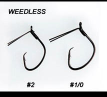 • Dois anzóis de pesca weedless pretos, identificados como #2 e #1/0, sobre fundo branco.