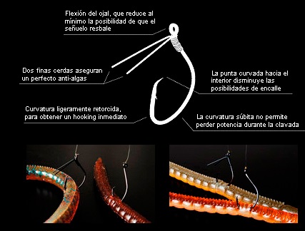• Gancho de pesca com características anti-algas e flexão do olhal, em fundo preto