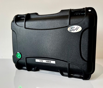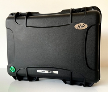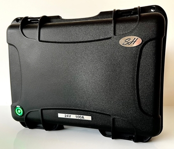 • Mala rígida preta com etiqueta '24V 100A' e selo 'HPS'
