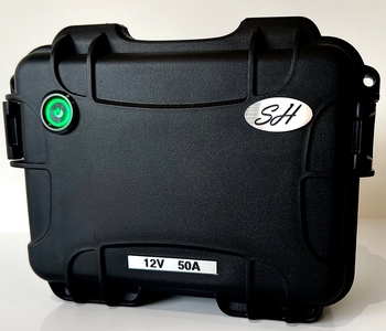 • Estojo rígido preto com botão verde e etiquetas SoH e 12V 50A