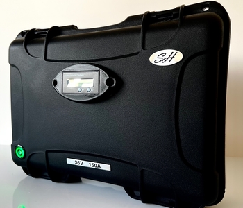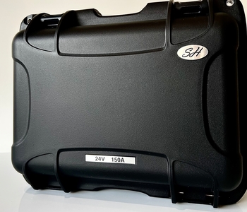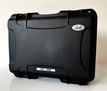 • Mala rígida preta com etiquetas '24V 150A' e selo 'SH'