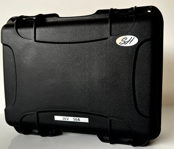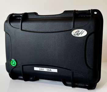 • Caixa preta de plástico com rótulos '24V 50A' e 'SH'