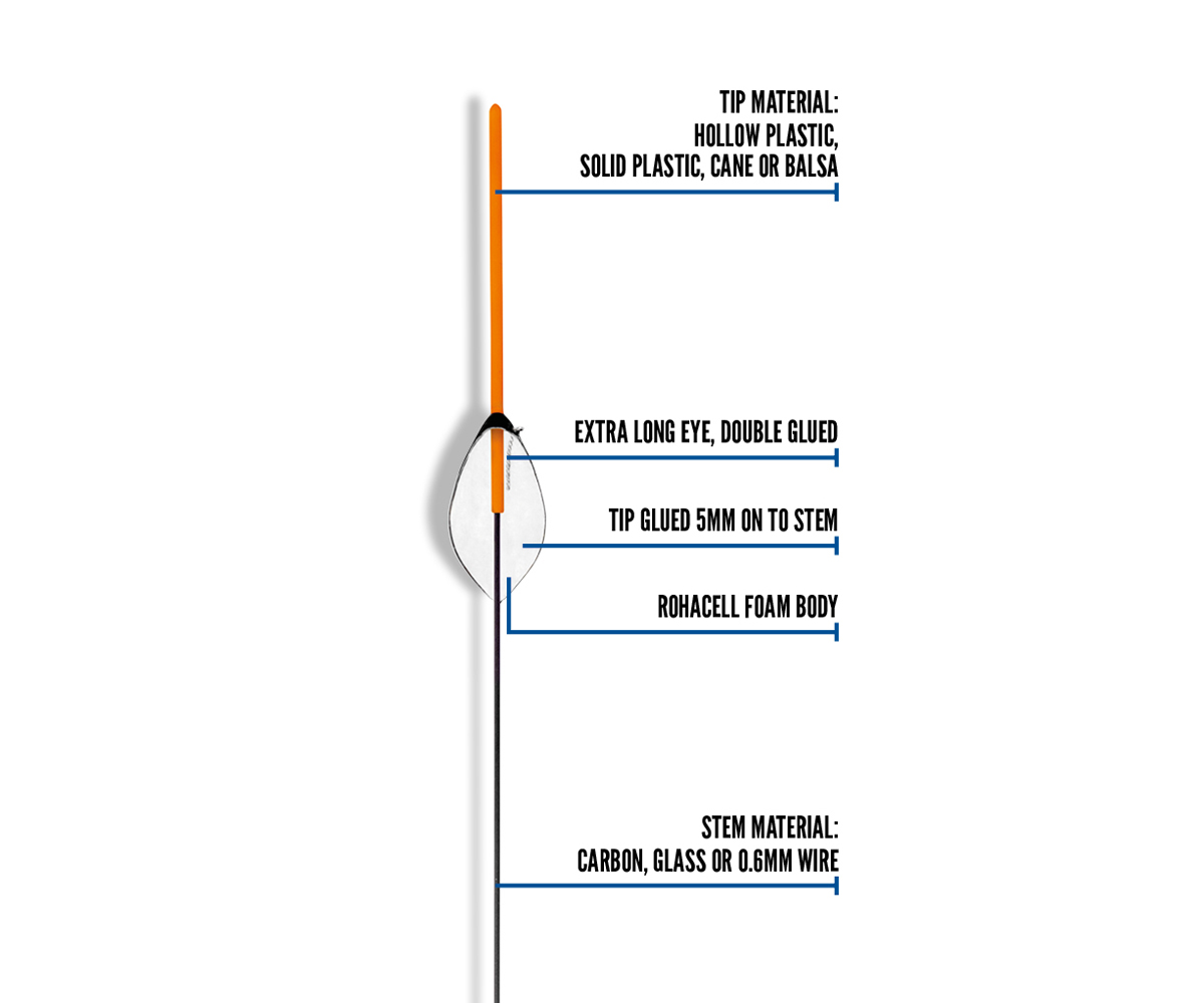 Todos os flutuadores são construídos usando um corpo de espuma Rohacell de grau resistente, aeroespacial para máxima durabilidade, enquanto as pontas e caules foram escolhidas manualmente pelo próprio International da Inglaterra para otimizar o uso pretendido de cada flutuador.
