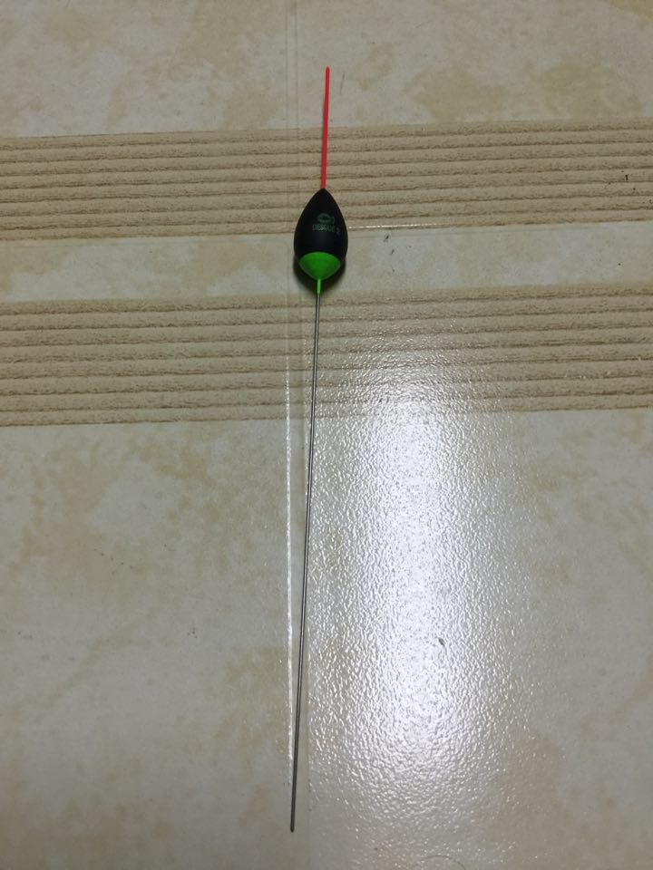 • Boia de pesca preta com base verde e antena vermelha sobre chão de azulejos claros