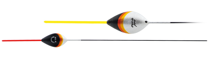 • Dois flutuadores de pesca com cores preto, amarelo e branco, texto 'Proline' e 'Expert' visíveis.