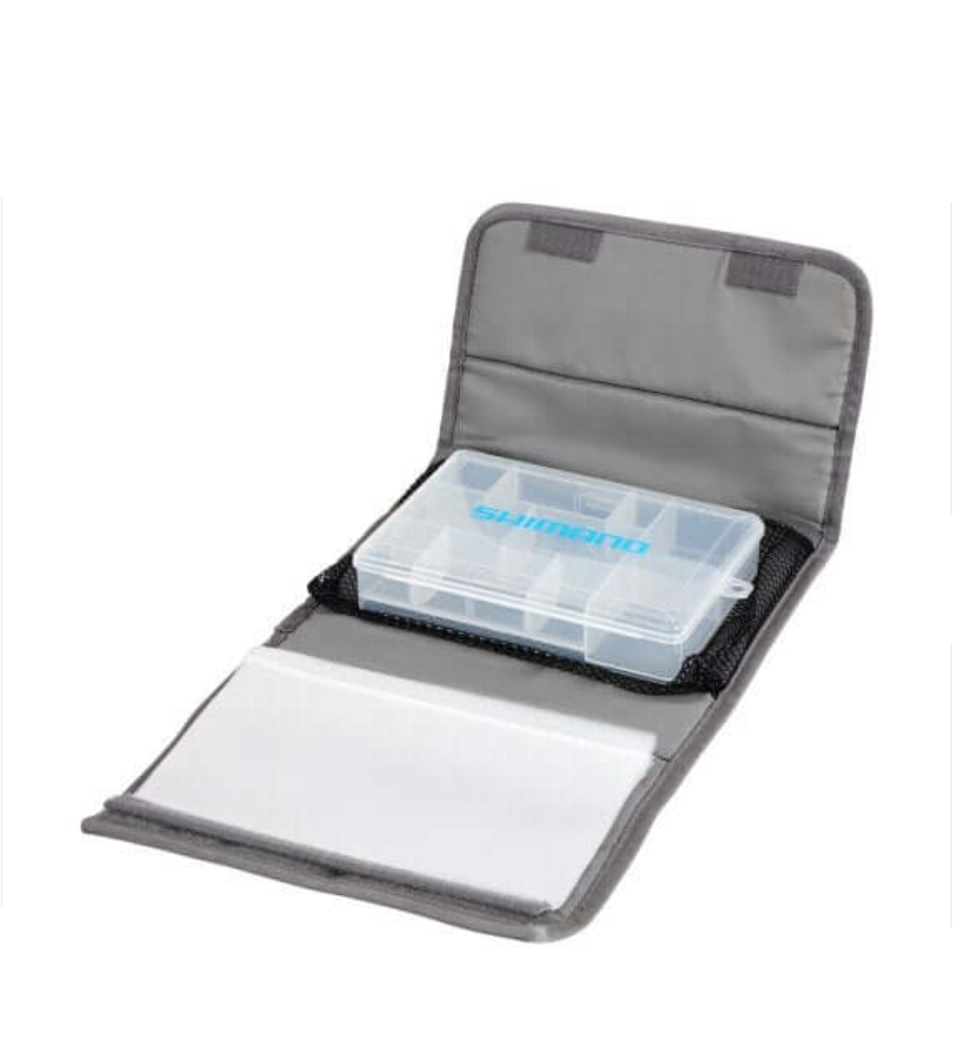 • Estojo cinzento aberto com caixa plástica transparente dentro e texto SHIMANO azul