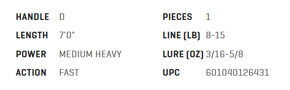 • Ficha técnica de vara de pesca com especificações detalhadas e código UPC