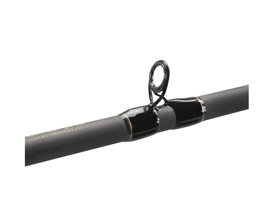 • Vara de pesca preta e bege com texto dourado em fundo branco