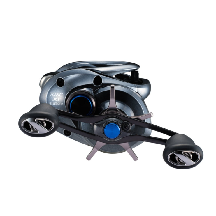 • Carretel de pesca Shimano XT 70XG cinza com detalhes azuis e alças pretas