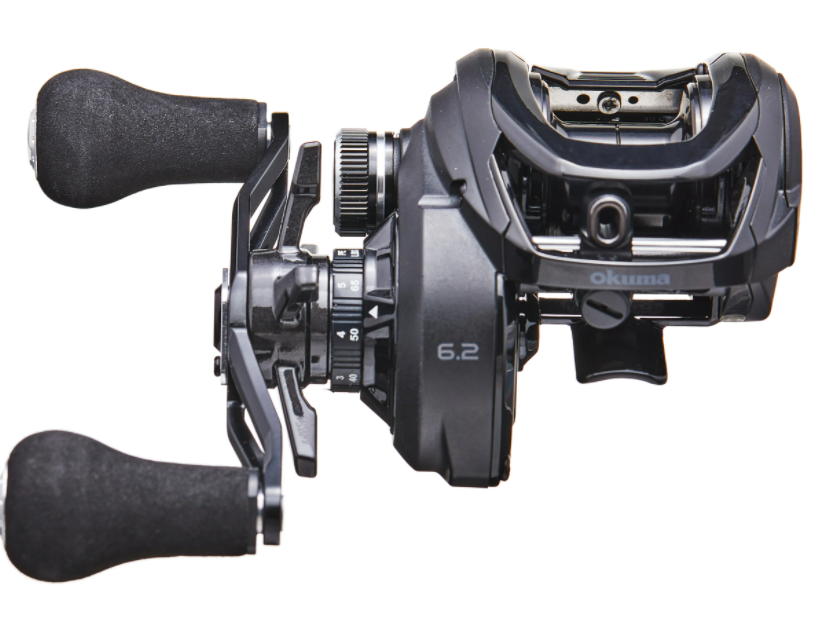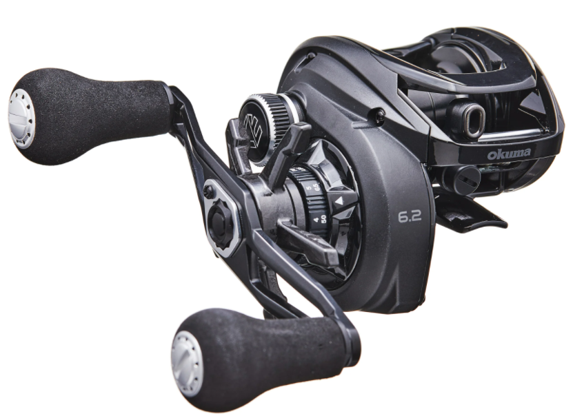 Carretel de pesca preto com punhos de espuma e inscrição 'okuma 6.2'