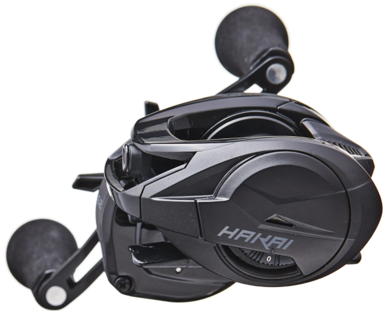 • Carretel de pesca preto com manivela dupla e texto HAKAI
