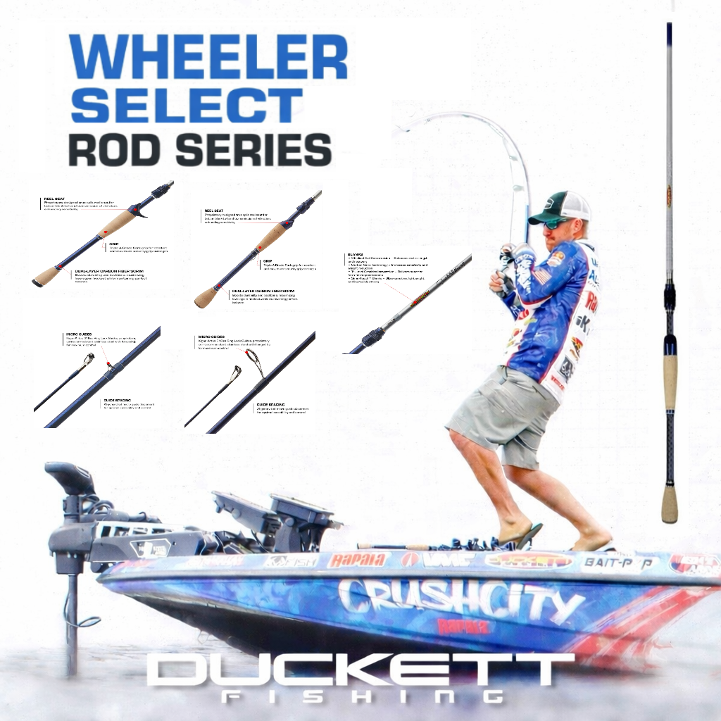 • Imagem promocional da série Wheeler Select Rod Series com pescador, cana de pesca e barco decorado azul