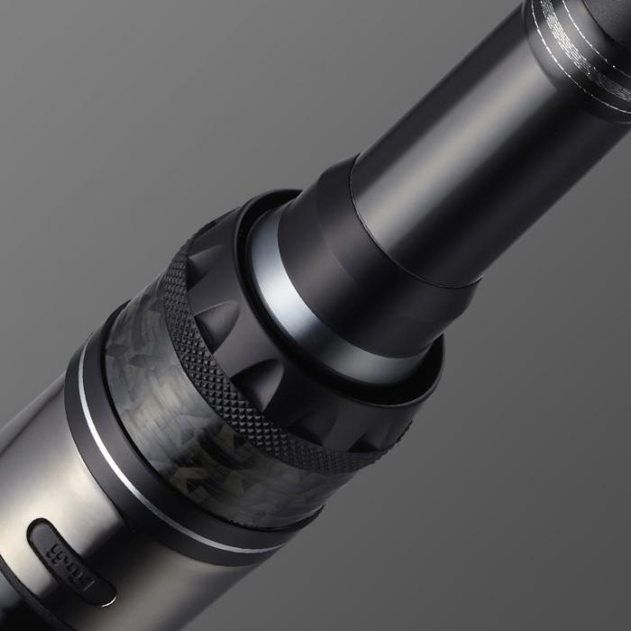 • Dispositivo metálico prateado e preto com fibra de carbono e botão 'UNLOCK'