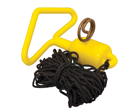 • Produto amarelo de plástico com corda preta e anel metálico