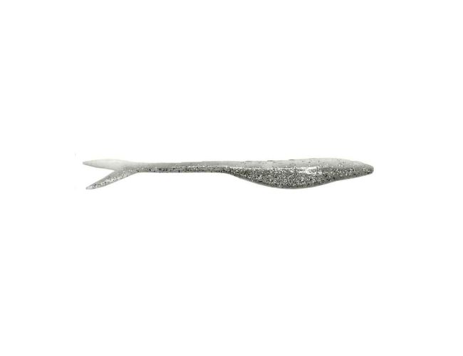 • Isca de pesca artificial cinzenta com brilho prateado e formato de peixe