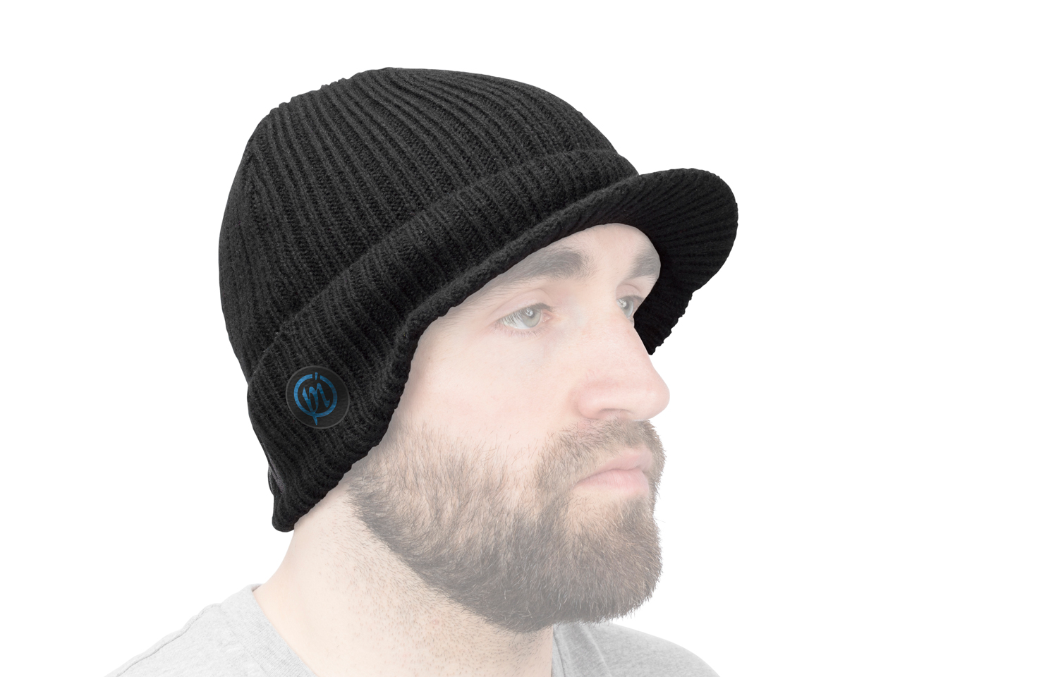• Gorro de malha azul claro e azul escuro com logótipo, usado por homem com barba