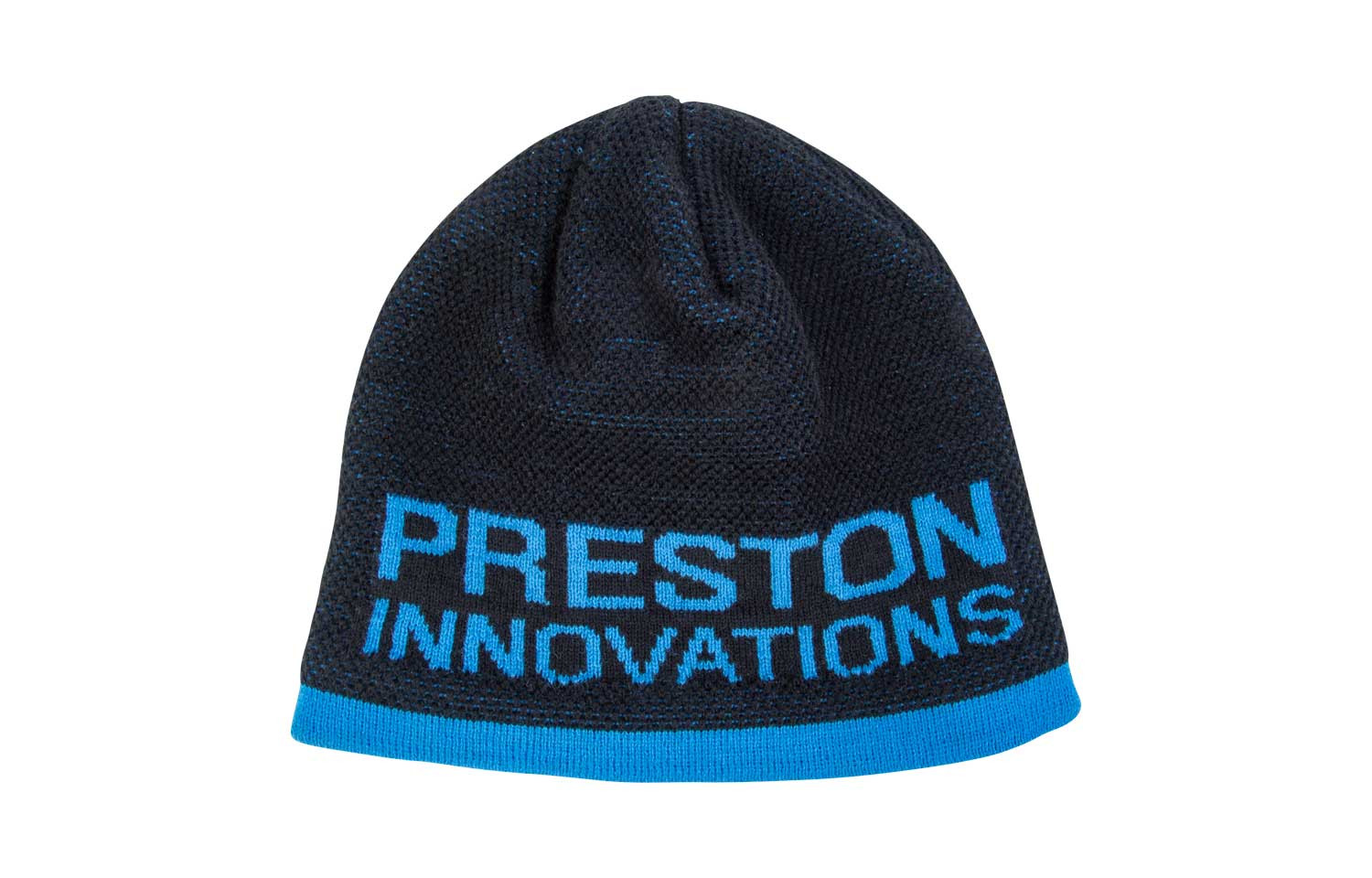 • Gorro de malha azul com texto 'PRESTON INNOVATIONS'.