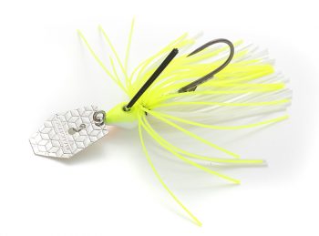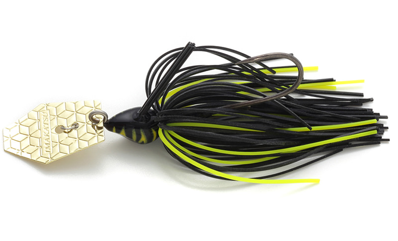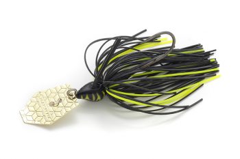 • Spinnerbait preto e amarelo para pesca com lâmina metálica prateada e padrão hexagonal