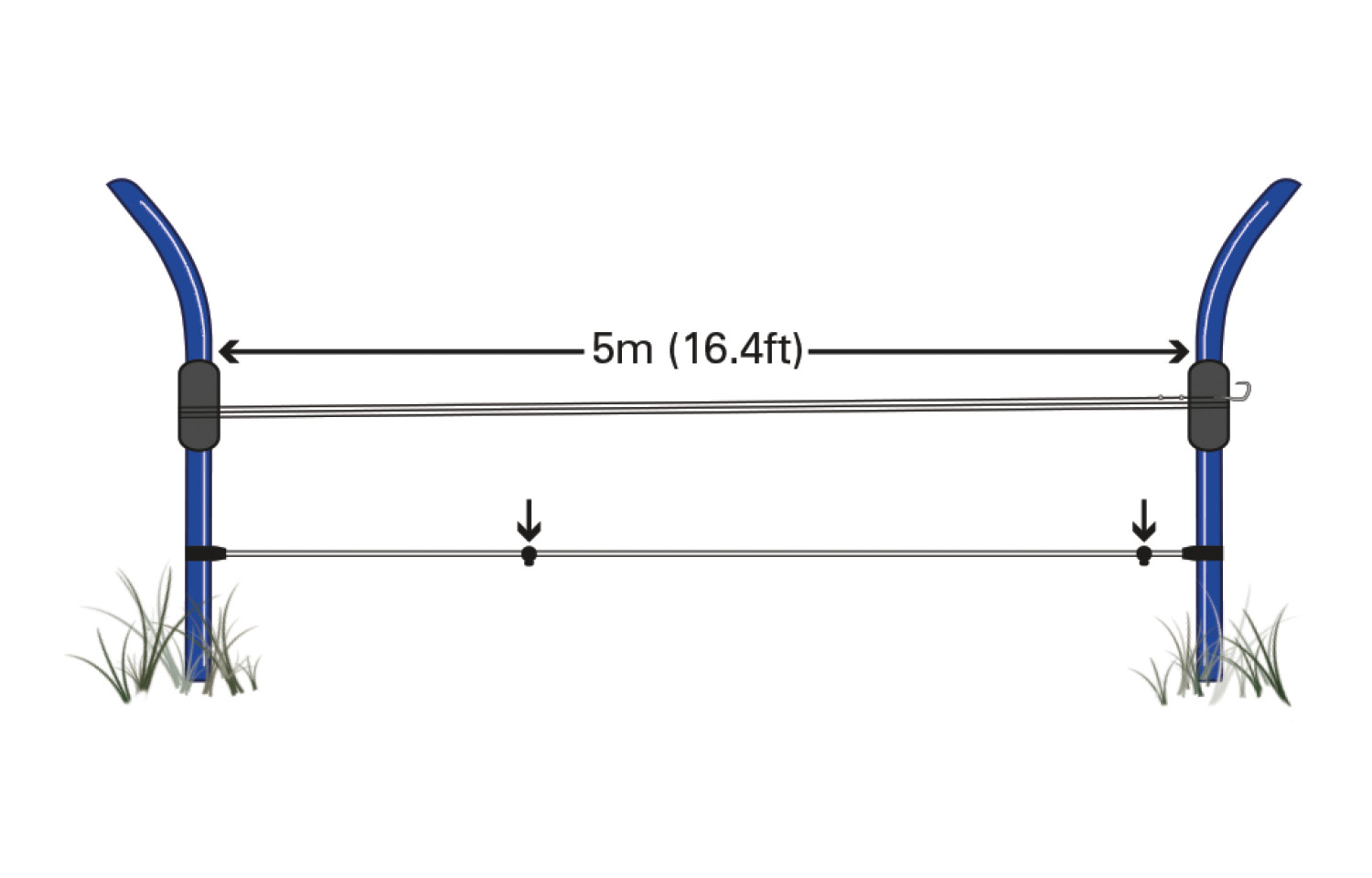 • Barreira de treino azul com barra horizontal de 5 metros sobre relva.