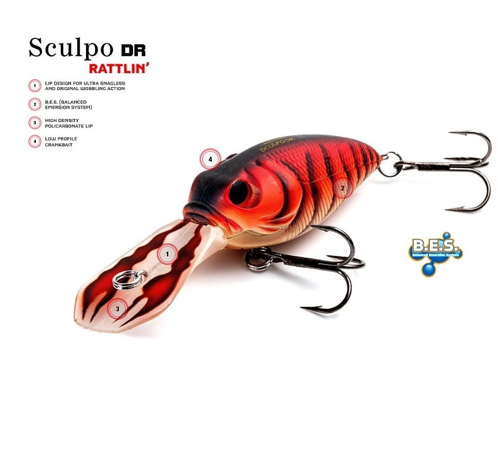 O SCULPO DR RATTLIN'  é um crankbait de alta tecnologia que incorpora todas as características mais importantes que um pescador procura em um crack desta categoria. Possui ação única, inovação e atenção aos detalhes. SCULPO DR RATTLIN'  tem um perfil baixo e uma de suas características é uma oscilação única e muito marcante, obtida por meio de extensos testes e estudos minuciosos da distribuição dos pesos em seu interior ( BES ). Essas características conferem à Sculpo um nado único e excelente desempenho anti-encalhe entre as pedras.