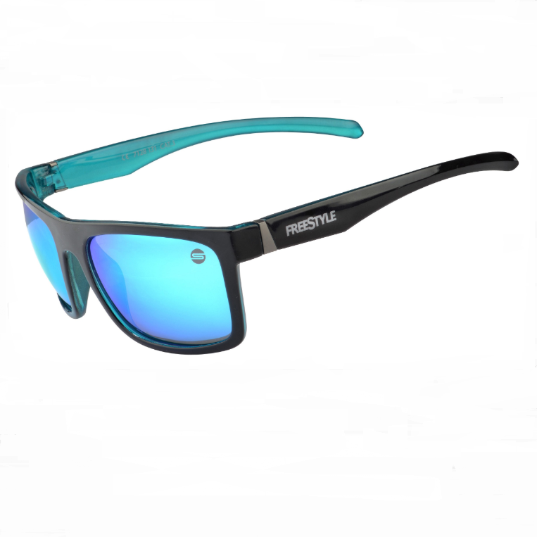 • Óculos de sol cinzentos com lentes espelhadas e texto FREESTYLE na haste