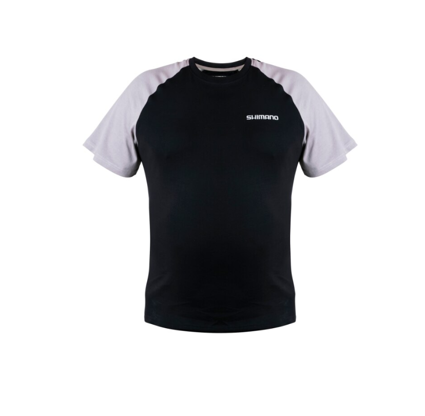 • T-shirt preta e cinza com texto SHIMANO no peito