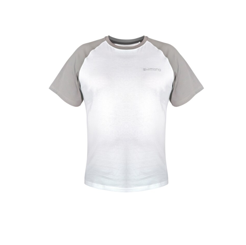 • T-shirt branca com mangas cinza claro e texto SHIMANO no peito