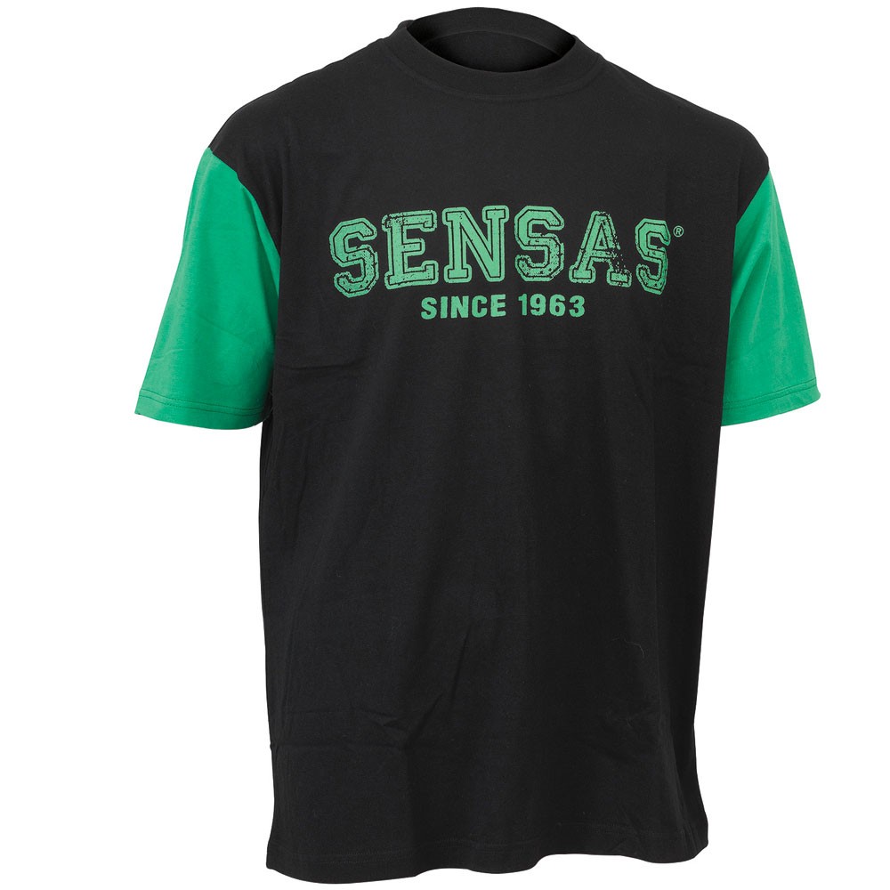 • T-shirt preta com mangas verdes e texto SENSAS® SINCE 1963